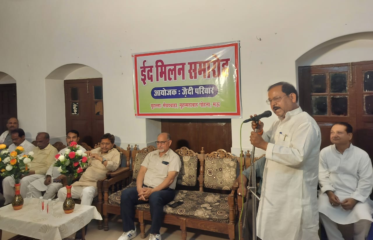मुहम्मदाबाद गोहना ÷ मऊ। स्थानीय नगर पंचायत के मोहल्ला सैयदवाड़ा स्थित प्रख्यात ज़ैदी परिवार के सौजन्य से शुक्रवार देर शाम ईद मिलन समारोह का आयोजन किया गया। इसके मुख्य अतिथि पूर्व मंत्री श्रीराम सोनकर, विशिष्ट अतिथि पूर्व चेयरमैन लालजी वर्मा व शकील अंसारी तथा संचालक अली इमदाद ज़ैदी सहित विभिन्न क्षेत्रों से जुड़ें गणमान्य लोंगों ने एक दूसरे को मुबारकबाद पेश की और ईद के पकवानों का लुत्फ उठाया।