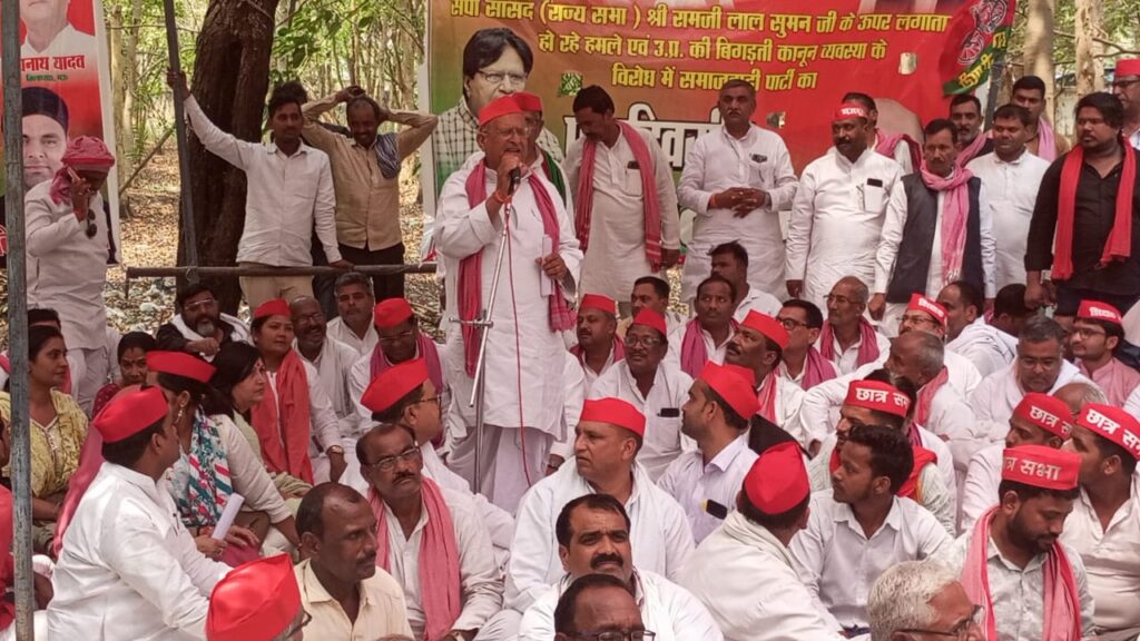 समाजवादी पार्टी ने मऊ जिला मुख्यालय पर जिला कलेक्टर आफिस के धरन ,राज्यसभा सांसद रामजीलाल सुमन पर हुए हमले के विरोध में समाजवादी पार्टी मऊ के जिला अध्यक्ष दुधनाथ यादव के नेतृत्व में धरना-प्रदर्शन आयोजित किया।