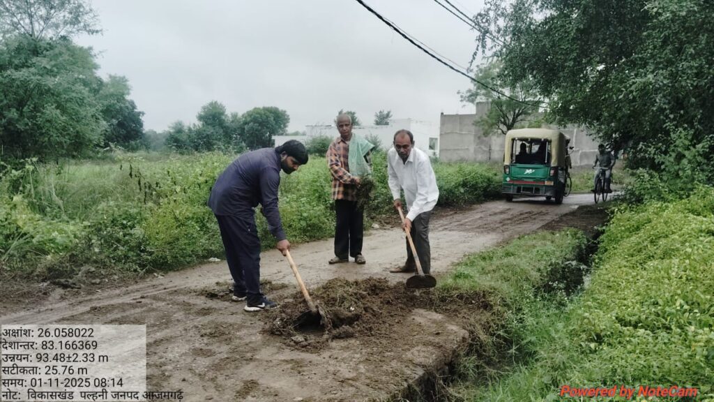 शनिवार, 1 नवंबर 2025 को सहायक विकास अधिकारी पंचायत की देखरेख में ग्राम पंचायत एकरामपुर में ग्रामीण सफाई कर्मचारियों ने नाले और नालियों की सफाई करते हुए रोड पर जमा मिट्टी को हटाया।