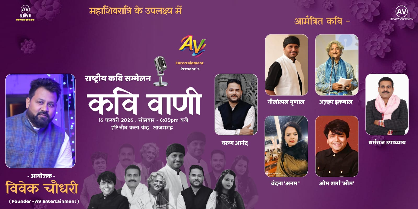 आजमगढ़ / AV इन्टरमेन्ट के तत्वावधान में 16 फरवरी को आजमगढ़ सायं 6:00 pm जनपद के हरिऔध कला केंद्र में आयोजित AV –कवि सम्मेलन में देश के विभिन्न जगहों से कवि और कवियित्री जुटेंगी। एवं अभिनंदन समारोह में कई लोगों को सम्मानित किया जाएगा। कार्यक्रम के आयोजक विवेक चौधरी ने बताया कि आजमगढ़ जनपद के हरिऔध कला केंद्र में कवि सम्मेलन का आयोजन AV एंटरटेनमेंट के बैनर तले यह कार्यक्रम होगा। उन्होंने बताया कि आजमगढ़ जनपद के हरिऔध कला केंद्र में नामित कवि -नीलोत्पल मृणाल