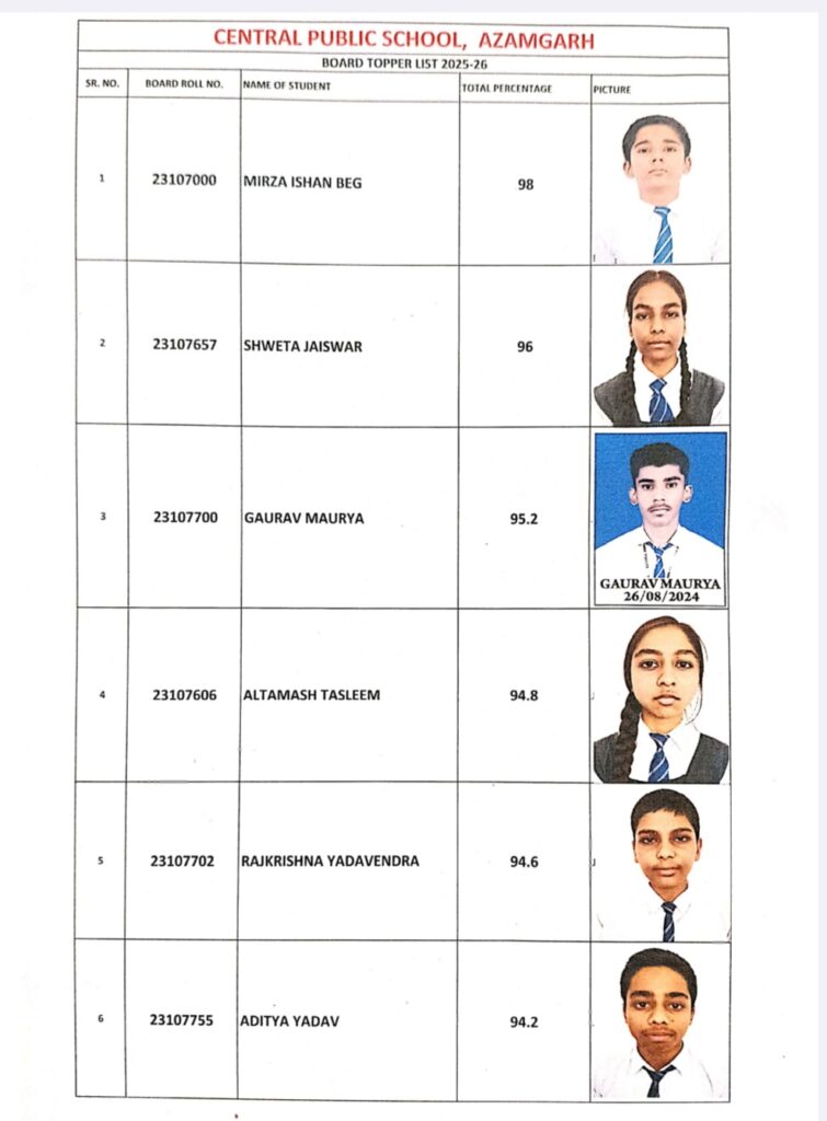 आजमगढ़। जनपद के जाफरपुर स्थित सेंट्रल पब्लिक स्कूल का CBSE कक्षा-10 सत्र 2025-26 का परीक्षा परिणाम शत-प्रतिशत रहा। विद्यालय के छात्र-छात्राओं ने उत्कृष्ट प्रदर्शन करते हुए जिले में अपनी प्रतिभा का परचम लहराया।