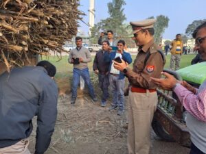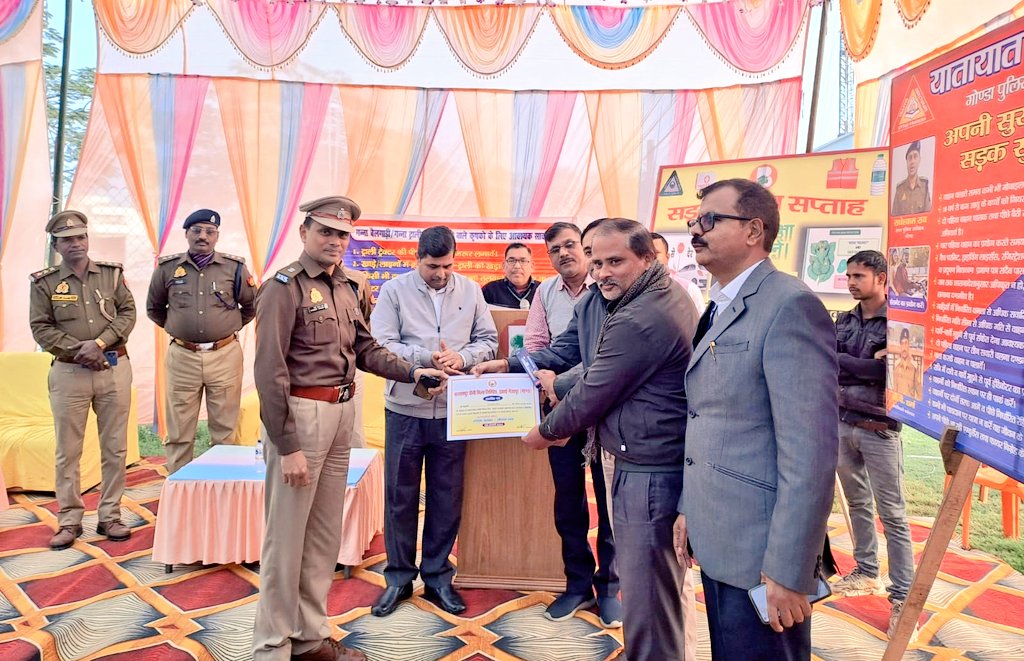 पुलिस अधीक्षक गोण्डा श्री विनीत जायसवाल महोदय के निर्देशन में अपर पुलिस अधीक्षक श्री राधेश्याम राय द्वारा आज दिनाकं 08.01.2024 को #सड़क_सुरक्षा_सप्ताह के तहत मिर्जापुर चीनी मिल में आयोजित यातायात जागरूकता अभियान में किसानों एवं कर्मचारियों को यातायात नियमों के बारे में जागरूक किया गया। गन्ना ट्राली में आने वाले किसानों को ट्राली-टैक्टर के पीछे रिफ्लेक्टर लगवाने, खड़े/लाइनों में क्रमवार टैक्टर-ट्राली को खड़ा करने, ट्रैक्टर–ट्राली के नीचे न सोने, आगे पीछे एव नीचे देखकर ही आगे बढाने आदि के सम्बन्ध में आवश्यक सावधानी रखने हेतु बताया गया। यातायात जागरूकता के दौरान अपर पुलिस अधीक्षक गोण्डा द्वारा उपस्थित किसानों एवं कर्मचारियों को बताया गया कि स्वय व अपने परिवार के सदस्यों को वाहन चलाते समय मोबाइल फोन, ईयर फोन का प्रयोग न करें, दो पहिया वाहन पर चालक तथा पीछे बैठे व्यक्ति हेलमेट सदैव प्रयोग करे, चार पहिया वाहन चालको को सीटबेल्ट का प्रयोग करने, वैध परिमिट, ड्राइविंग लाइसेंस, रजिस्ट्रेशन, बीमा एवं प्रदूषण नियंत्रण प्रमाण पत्र पास रखने, वाहनों में निर्धारित सवारी बैठाने एवं निर्धारित गतिसीमा में वाहनों को चलाने, वाहन चलाते समय मादक पदार्थो का प्रयोग न करने के लिए बताया गया। यातायात नियमों का पालन करने वाले किसानों एवं कर्मचारियों को प्रशस्ति पत्र व पेन देखकर उन्हें सम्मानित किया गया।