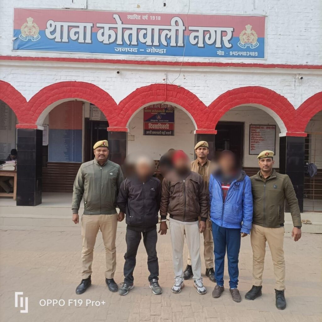गोण्डा पुलिस अधीक्षक विनीत जायसवाल द्वारा अपराध एवं अपराधियों के विरूद्ध चलाये जा रहे अभियान के क्रम में अपर पुलिस अधीक्षक गोण्डा श्री राधेश्याम राय के पर्यवेक्षण व क्षेत्राधिकारी नगर श्री विनय कुमार सिंह के नेतृत्व में थाना कोतवाली नगर पुलिस टीम द्वारा कड़ी मेहनत व अथक प्रयासोपरांत मु0अ0सं0 112/2022 धारा 419, 420, 467, 468, 471, 504,506,120बी भा0द0वि0 थाना को0नगर से सम्बन्धित 03 वांछित अभियुक्तों 01. जुम्मन, 02. आसिफ व 03. रसूल करीम को ग्राम बेलावां प्राइमरी स्कूल के पास से गिरफ्तार कर लिया गया।
