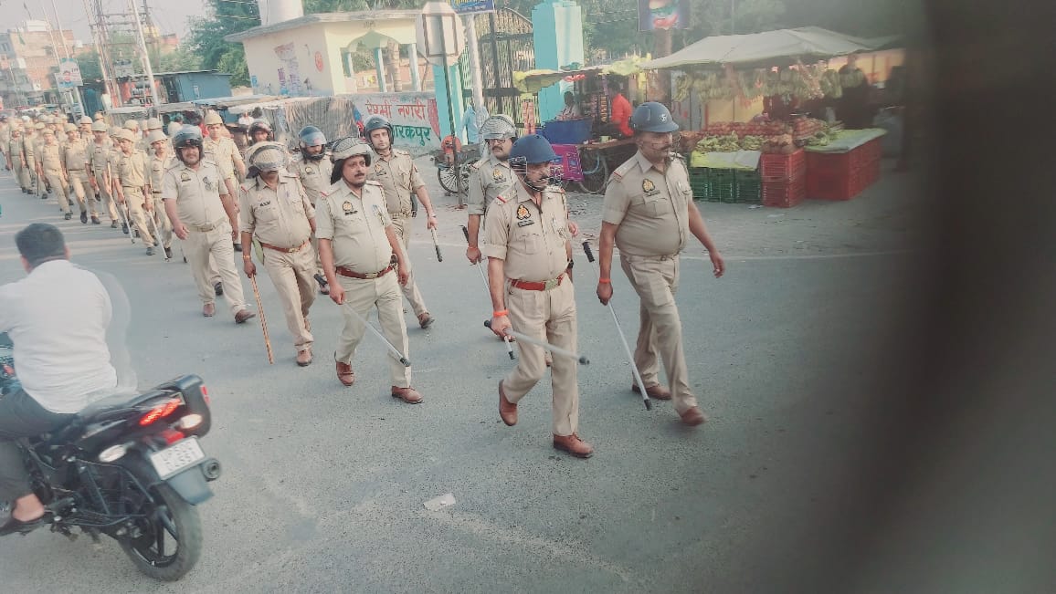 मुबारकपुर थाना गेट से अमन रूट मार्च निकालते हुए पुलिस बल।