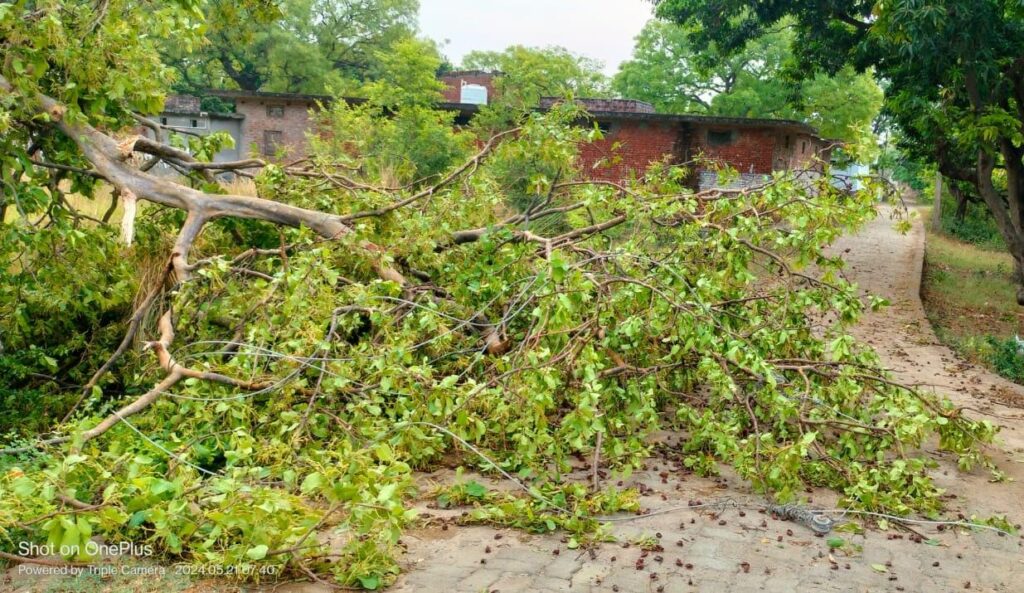 बता दें कि दो दिन से चल रही पुरुवा हवाओं ने आधी रात और भोर के बीच तूफान का रूप धारण कर लिया। तेज गति से हवा-पानी ने झोपड़ी, टिनशेड व सीमेंट की चादरों को तोड़-फोड़कर गिरा दिया। इस बार लगे आम के अच्छे फलों को भी भारी छति पहुंची है। करहां,घुटमाँ, शमशाबाद, नगपुर, माहपुर, मील, जमुई, टड़वा आदि दर्जन भर स्थानों पर पेड़ गिरने से तार, केबिल व खम्भे टूट गये। इनकी बिजलीकर्मियों द्वारा कड़ी मशक्कत से साफ-सफाई, कटाई आदि कर मरम्मत की गई व बिजली व्यवस्था बहाल कराई गई।