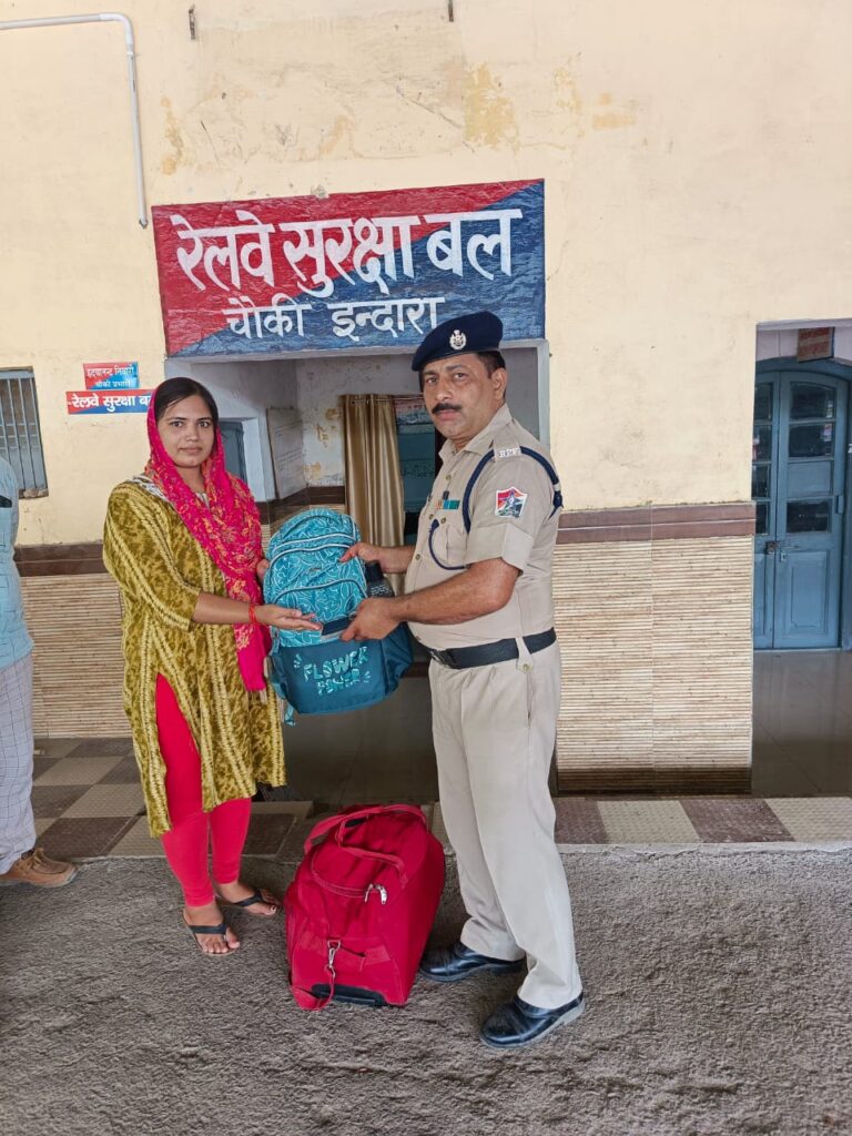 इंदारा।रेलवे सुरक्षा बल मऊ की सूचना पर गाड़ी संख्या 05478 के कोच संख्या 238642 मे एक लगेज बैग व एक पिट्ठू बैग तथा एक मोबाइल छूटे होने की सूचना पर इन्दारा स्टेशन प्लेटफार्म ड्यूटी पर तैनात कॉन्स्टेबल सुनील कुमार यादव द्वारा उक्त गाड़ी के उक्त कोच से प्राप्त कर निगरानी में रखा गया था। एक यात्री नाम पता दीक्षा राय D/O अनिरुद्ध राय निवासी ग्राम बसीया राम थाना दोहरीघाट,जिला मऊ।चौकी पर उपस्थित हुई तथा बताइ कि उक्त गाड़ी से वह रामबाग से सामान्य टिकट लेकर दोहरीघाट आने के क्रम मे मऊ स्टेशन पर पानी खरीदने के लिए गाड़ी से उतरने के दौरान गाड़ी प्रस्थान कर गयी और उनका बैग व मोबाइल गाड़ी मे छूट गया।जिसकी सूचना आरपीएफ पोस्ट मऊ पर दी l बाद पूछताछ बैग में रखे सामानों का मिलान कर आधार कार्ड की छाया प्रति प्राप्त कर मंगलवार को इंदारा आरपीएफ चौकी हेड कांस्टेबल राजेंद्र सिंह यादव व उप निरीक्षक हृदयानंद तिवारी द्वारा उक्त बैग यात्री को सुपुर्द किया गया। यात्री द्वारा बैग व उसमें रखे सामान की कीमत रुपया 18500 बताया गया ।यात्री द्वारा अपना सामान सुरक्षित पाकर आरपीएफ की काफी प्रशंसा की।