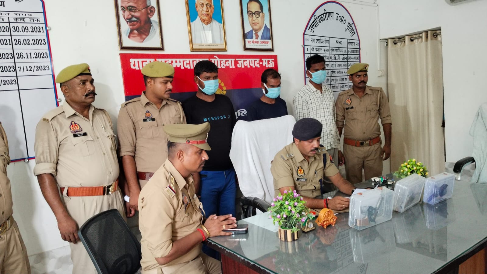 जनपद मऊ के पुलिस अधीक्षक इलामारन जी के निर्देशन में अपराध/अपराधियों के विरुद्ध चलाये जा रहे अभियान के क्रम में अपर पुलिस अधीक्षक महेश सिंह अत्री के कुशल पर्यवेक्षण में क्षेत्राधिकारी मुहम्मदाबाद के नेतृत्व में थाना मुहम्मदाबाद पुलिस को उस समय अहम सफलता हाथ लगी जब शुक्रवार को देखभाल क्षेत्र व चेकिंग के दौरान जरिये मुखबिर की सूचना पर कि दो दिन पूर्व खुशामदपुर में चली गोली कांड से सम्बन्धित (मु0अ0सं0 195/2024 धारा 34/307/504/506 भादवि) वांछित अभियुक्त जो कमालपुर कोलौरा की तरफ से आ रहे व मड़ैया चट्टी होते हुए कही जाने की फिराक में है, इस सूचना पर पुलिस टीम मड़ैया चट्टी से कमालपुर कोलौरा को जाने वाली रोड पर कुछ दूर अन्दर जाकर भठ्ठे के पास कमालपुर कोलौरा की तरफ से तीन व्यक्ति आते हुए दिखायी दिये कि तीनो व्यक्तियो के और पास आने पर पुलिस टीम व्यक्तियो को रोकने का इशारा किया गया तो तीनो व्यक्ति एकाएक पुलिस वालो को देखकर पीछे मुड़कर भागना चाहे कि पुलिस टीम द्वारा तीनो व्यक्तियों को पकड़ लिया गया। पकड़े गये व्यक्तियों से नाम पता पूछा गया तो 1. रामप्रवेश यादव पुत्र अन्तू यादव समस्त साकिन खुशामदपुर थाना मु0बाद गोहना जनपद मऊ 2. मनोज यादव पुत्र अन्तू यादव निवासी खुशामदपुर थाना मु0बाद गोहना जनपद मऊ 3. विनोद यादव पुत्र अन्तू यादव निवासी खुशामदपुर थाना मु0बाद गोहना जनपद मऊ बताये जामा तलाशी के दौरान अभियुक्तगणों के पास से एक अदद अबैध पिस्टल .32 बोर व दो अदद अबैध तमंचा 315 बोर व दो अदद जिन्दा कारतूस .32 बोर व दो अदद जिन्दा कारतूस 315 बोर बरामद हुआ। कड़ाई से पूछताछ पर बताये कि साहब हम लोगो का मुलायम यादव उर्फ बृजेश यादव पुत्र सूर्यनाथ यादव निवासी खुशामदपुर थाना मु0बाद गोहना जनपद मऊ से जमीनी विवाद चला आ रहा है, उसी विवाद को लेकर बिते19 तारिख को हम लोगो में मारपीट हूई हमारे ही गांव के रहने वाले अजीत यादव व अजय यादव पुत्रगण श्रीचन्द यादव जो मुलायम यादव का सपोर्ट करते थे, उसी दिन शाम के समय हम लोग व तीन अन्य अमर यादव, अजय यादव व मोनू यादव एक साथ मिलकर रात के समय 8.00 बजे के लगभग अजीत यादव व अजय यादव के घर पर पहूंचकर अजीत व अजय को जान से मारने की नीयत से फायर कर दिया, लेकिन वो लोग किसी तरह बच गये उसके बाद गांव के लोग आ गये तो हम लोग हवाई फायरिंग करते हुए वहा से भाग गये तथा आज जो पिस्टल मेरे पास से बरामद हुई है, यह वही पिस्टल है। इस सम्बन्ध में उक्त अभियोग में धारा 3/25 आयुद्ध अधिनियम के अर्न्तगत अभियोग पंजीकृत कर चालान न्यायालय किया गया।