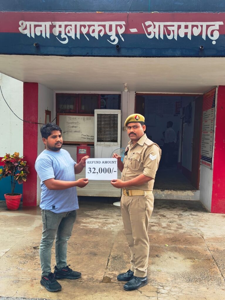 रूपया वापसी का विवरणःआवेदक अनिल कुमार पुत्र श्री शिवनरायन निवासी मोहल्ला चिवटही थाना मुबारकपुर जनपद आजमगढ के फ्रॉड हुए रूपयों के सम्बन्ध मे थाना मुबारकपुर की साइबर टीम प्रभारी निरीक्षक श्री निहार नन्दन कुमार के निर्देशन मे कम्प्यूटर ऑपरेटर मेहताब आलम द्वारा बैंक व साइबर सेल की मदद से जाँचोंपरान्त दिनांक 05.07.2024 को आवेदक अनिल कुमार का फ्रॉड हुए कुल 32000/- रूपया (100%) आवेदक के खाते मे वापस कराया गया है। आवेदक अपना फ्रॉड के माध्यम से कटा हुआ रूपया वापस पाकर पुलिस का आभार व्यक्ति किया है। जिसकी फोटो/विडियो संलग्न किया जा रहा है।
