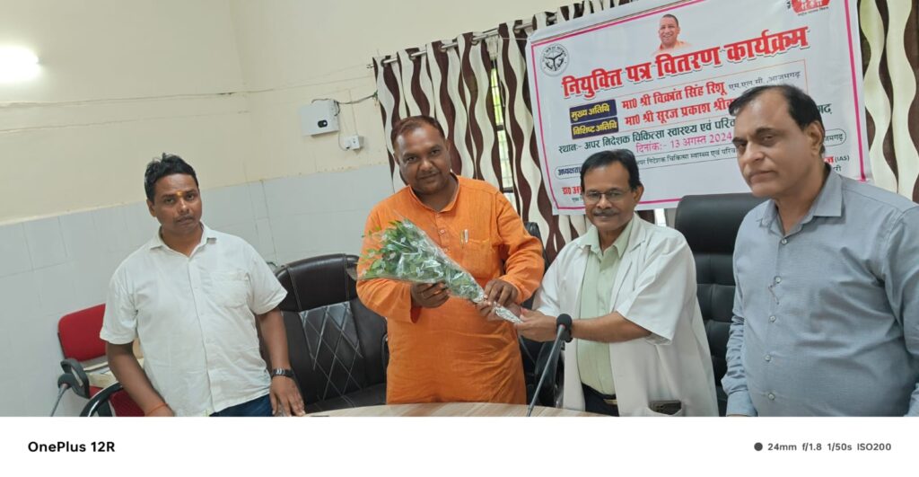 बलरामपुर। आजमगढ़ के जिले के अपर निर्देशक कार्यालय में मुख्य अपर निर्देशक चिकित्सा स्वस्थ एवं परिवार कल्याण आजमगढ़ डा आमोद कुमार, एसीएमओ उमा सरण पांडेय के उपस्थिति में जिला अपर निर्देशक कार्यालय में एमएलसी बिनित सिंह रिसू व लालगंज अध्यक्ष सूरज प्रकाश के द्वारा सहायक सोध अधिकारी चयनित उम्मीदवार में 21 नियुक्ति पत्र में से 19 को नियुक्ति पत्र मंगलवार की सुबह 11.00 बजे दिया गया जिसमे 2 उम्मीदवार उपस्थित नहीं थे यह कार्य क्रम उत्तर प्रदेश अधीनस्थ सेवा चयन आयोग लखनऊ स्तर पर माननीय मुख्यमंत्री जी के द्वारा सहायक शोध अधिकारी के पद पर चयनित अभ्यर्थियों के नियुक्ति पत्र वितरण समारोह आयोजन के तहत किया गया जिसमे मऊ जिले में 8 नियुक्ति पत्र मुख्य चिकित्सा अधिकारी मऊ को भेज दिया गया वहीं बलिया जिले में 13 नियुक्ति पत्र मुख्य चिकित्सा अधिकारी बलिया को भेज दिया गया कार्यक्रम में उपस्थित अपर निर्देशक कार्यालय में कार्यरत कर्मचारी प्रकाश, एन के मिश्रा, मुरली मनोहर आदि कर्मचारी उपस्थित थे
