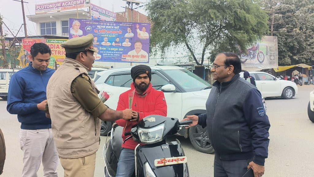 सड़क सुरक्षा अभियान की अंतर्गत हेलमेट सीटबेल्ट ना लगाने वालों को पुष्प देकर किया गया प्रेरित