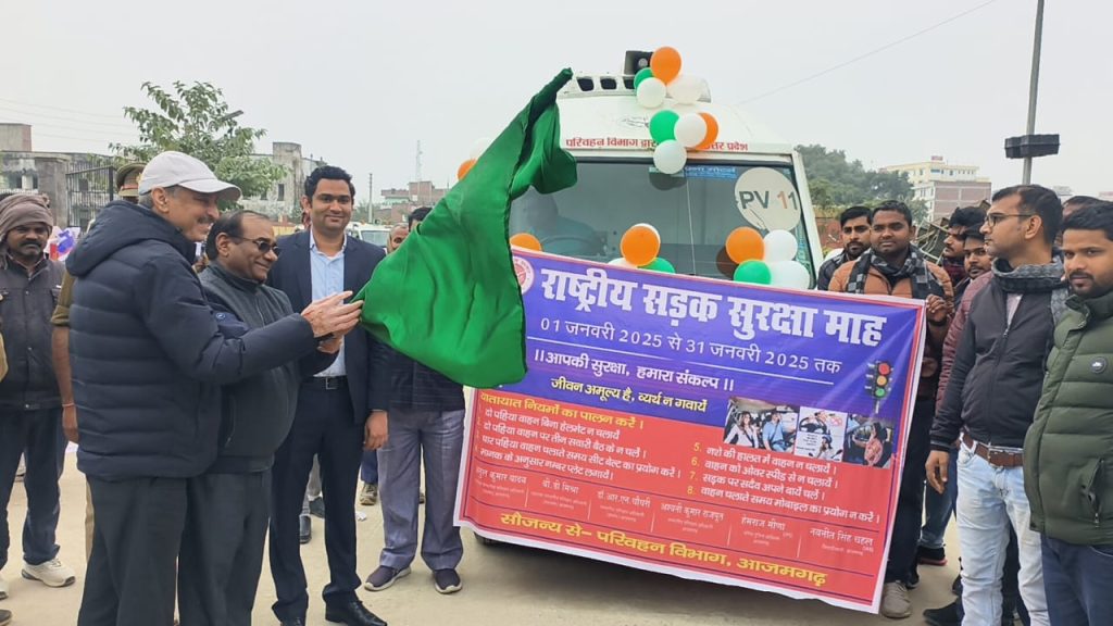 भारत में राष्ट्रीय सड़क सुरक्षा माह 1 जनवरी से 31 जनवरी, 2025 तक मनाया जा रहा है, इस अवधि के दौरान, अभियान, कार्यशालाएँ और कार्यक्रम नागरिकों को यातायात नियमों का पालन करने के महत्व के बारे में शिक्षित करने पर ध्यान केंद्रित करते हैं। राष्ट्रीय सड़क सुरक्षा माह 2025 का लक्ष्य सभी के लिए सुरक्षित सड़कों को बढ़ावा देना है। जिसके क्रम में आजमगढ़ संभागीय परिवहन अधिकारी आर एन चौधरी ने कार्यक्रम का शुभारंभ करते हुए बताया कि राष्ट्रीय सड़क सुरक्षा माह में लोगों को जागरूक किया जा रहा है कि लोग ठंड के मौसम में हेलमेट और सीट बेल्ट के साथ-साथ अपने वाहनों पर रिफ्लेक्टर टेप लगाकर चलें जिससे दुर्घटनाओं से बचा जा सके। इसी कड़ी में उन्होंने बताया कि सभी लोगों से अनुरोध भी है कि जो भी वहां चला रहे हैं वह अपने परिवार के लिए पूरी दुनिया है इसलिए अपने जान की सुरक्षा स्वयं करें। इसके प्रचार प्रसार हेतु पब्लिक सिटी वैन को हरी झंडी दिखाकर रवाना किया। उक्त कार्यक्रम के अवसर पर संभागीय प्रवर्तन अधिकारी अतुल कुमार यादव आर आईं पवन सोनकर सहित अन्य अधिकारी व कर्मचारी उपस्थित रहे।