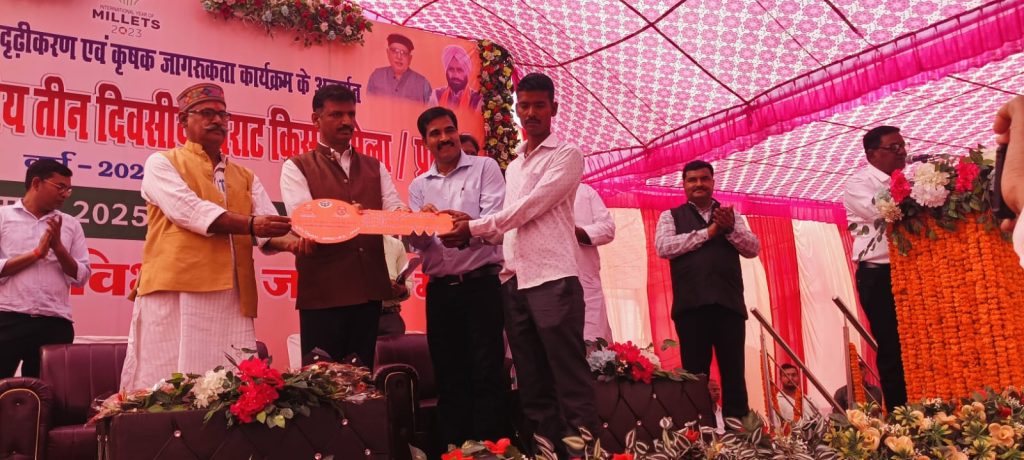 जनपद मऊ के कलेक्ट्रेट परिसर में जनपद स्तरीय तीन दिवसीय किसान मेला/प्रदर्शनी का आयोजन किया गया। मेले का शुभारंभ विधायक राम विलास चौहान द्वारा फीता काटकर किया गया। प्रदर्शनी के दौरान विभिन्न विभागों द्वारा स्टॉल लगाए गए। लगाए गए स्टालों का अवलोकन विधायक, जिलाधिकारी, उप कृषि निदेशक, जिला कृषि अधिकारी सहित अन्य अधिकारियों द्वारा किया गया। किसानों को संबोधित करते हुए विधायक ने बताया कि नई तकनीकी के उपकरणों द्वारा अधिक फसल उपज करने के लिए किसान विशेष ध्यान दें, पूर्व से बेहतर कार्य वर्तमान सरकार में हो रहा है। उन्होंने कहा कि किसानों को बेहतर खेती की तकनीकी जानकारी कृषि वैज्ञानिकों द्वारा विस्तार पूर्वक दी जाएगी। जिलाधिकारी ने बताया कि तीन दिवसीय किसान मेले का किसान भरपूर लाभ उठाएं विभिन्न क्षेत्रों से आए कृषि वैज्ञानिको से मिलकर फसलों से संबंधित जानकारी प्राप्त करें। मेले में खेती से जुड़े सभी उपकरण आधुनिक है, निश्चित रूप से किसान भाइयों द्वारा किए जा रहे फसल की उपज में वृद्धि होगी। उन्होंने मोटे अनाज की उपज के लिए किसानों को अधिक ध्यान देने को कहा।