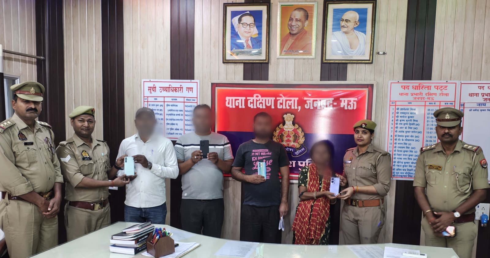 पुलिस अधीक्षक मऊ इलामारन जी के निर्देशन में अपराध/अपराधियों के विरूद्ध चलाये जा रहे अभियान के क्रम में थाना दक्षिणटोला साइबर टीम द्वारा थाना स्थानीय पर दर्ज गुमशुदगी को सीईआईआर पोर्टल के माध्यम से गुमशुदा मोबाइल धारको का आज 24 मार्च को थाना स्थानीय पर नियुक्त साइबर टीम द्वारा गुमशुदा 04 मोबाइलों लगभग 72,000 (बहत्तर हजार) रुपये कीमती को बरामद कर उनके स्वामियों को सुपुर्द किया गया। जिसमें राजीव सिंह चौहान पुत्र राजेन्द्र चौहान निवासी प्रेमनगर चकिया थाना दक्षिणटोला, कमलेश राजभर पुत्र स्व0 धर्मदेव राजभर निवासी नन्दू पोखरा थाना कोतवालीन नगर, ओमनरायन गुप्ता पुत्र स्व0 चिरौजी प्रसाद गुप्ता निवासी मिर्जाहादीपुरा थाना दक्षिणटोला, मो0 सलमान पुत्र मो0 असलम निवासी प्यारेपुरा थाना दक्षिणटोला जनपद मऊ आवेदको द्वारा उच्चाधिकारियों व थाना दक्षिणटोला के अधिकारी/ कर्मचारियों का आभार व्यक्त किया ।