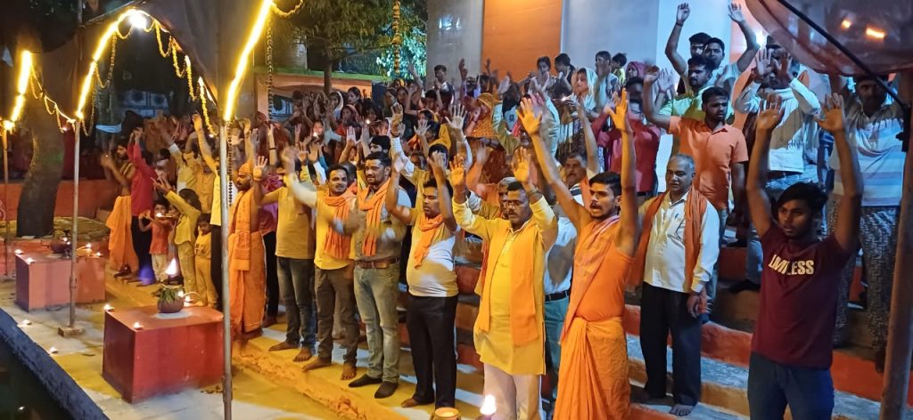हिन्दू नव वर्ष व चैत्र नवरात्र के पावन अवसर पर हिन्दू युवा वाहिनी जनपद मऊ द्वारा लैरो दोनवार के प्राचीन शिव मंदिर पर महाआरती व फलहार का आयोजन किया गया जिसमें सैकड़ों की संख्या में हिन्दू जनमानस सम्मिलित हुआ।उक्त अवसर पर अजय सिंह योगी सेवक ने कहा कि पश्चिमी सभ्यता के चकाचौध में हम सब अपनी प्राचीन सनातन परम्परा को भूलते जा रहे है जिसके परिणाम स्वरूप संस्कारों में कमी आ रही है इसलिए आवश्यक है कि सनातन परम्परा से जुड़े आयोजन होते रहने चाहिए जिससे हमारी आने वाली पीढियां सनातन धर्म के प्रति जागरूक बने।हिन्दू युवा वाहिनी जनपद मऊ सदैव हिन्दुत्व पुनर्जागरण के लिए कार्य करती रही है इसी क्रम को आगे बढ़ाते हुए महाआरती व फलहार का आयोजन किया गया है।डॉ मिथलेश चौरसिया ने कहा की सनातन के प्रति जागरुकता बहुत आवश्यक है जिस तरह से विश्व मे अशान्ति फैली हुई है दूसरे धर्मों में एक दूसरे को नीचा दिखाने की होड़ लगी हुई है ऐसे में सनातन धर्म की स्वीकार्यता ही पूरे में शांति ला सकता है जिसे दुनिया के बहुत देशों ने स्वीकार भी किया है।उक्त अवसर पर सत्यप्रकाश पुजारी,भूपन सिंह मनोज कुमार अभिषेक सिंह,दुर्गेश सिंह सौरभ आर्यन संगम सहित सैकड़ों की संख्या में लोग उपस्थित रहे।